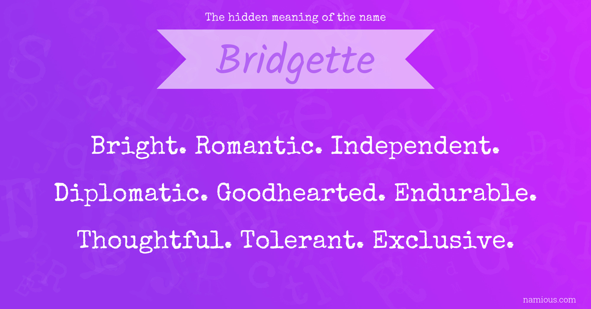 "Bridgette is a bright, romantic, independent, diplomatic, goodhearted, endurable, thoughtful, tolerant and exclusive person."