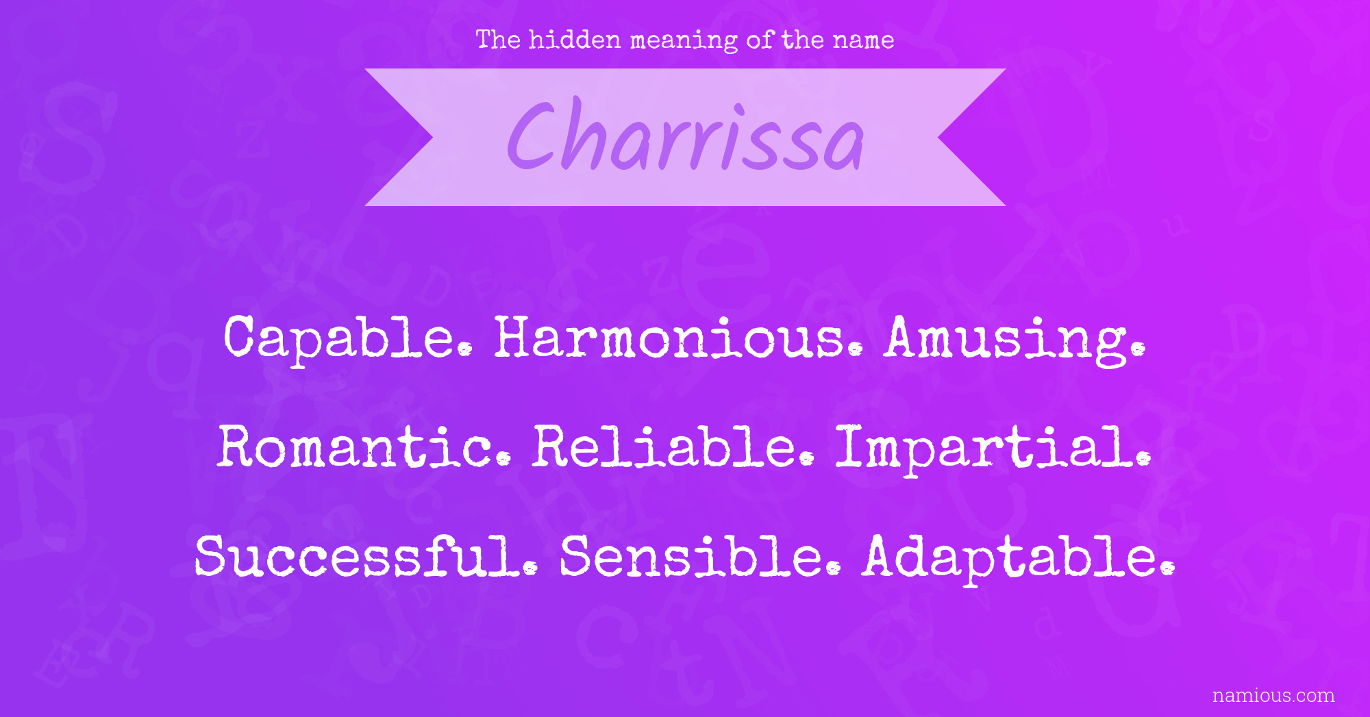 "Charrissa is a capable, harmonious, amusing, romantic, reliable, impartial, successful, sensible and adaptable person."