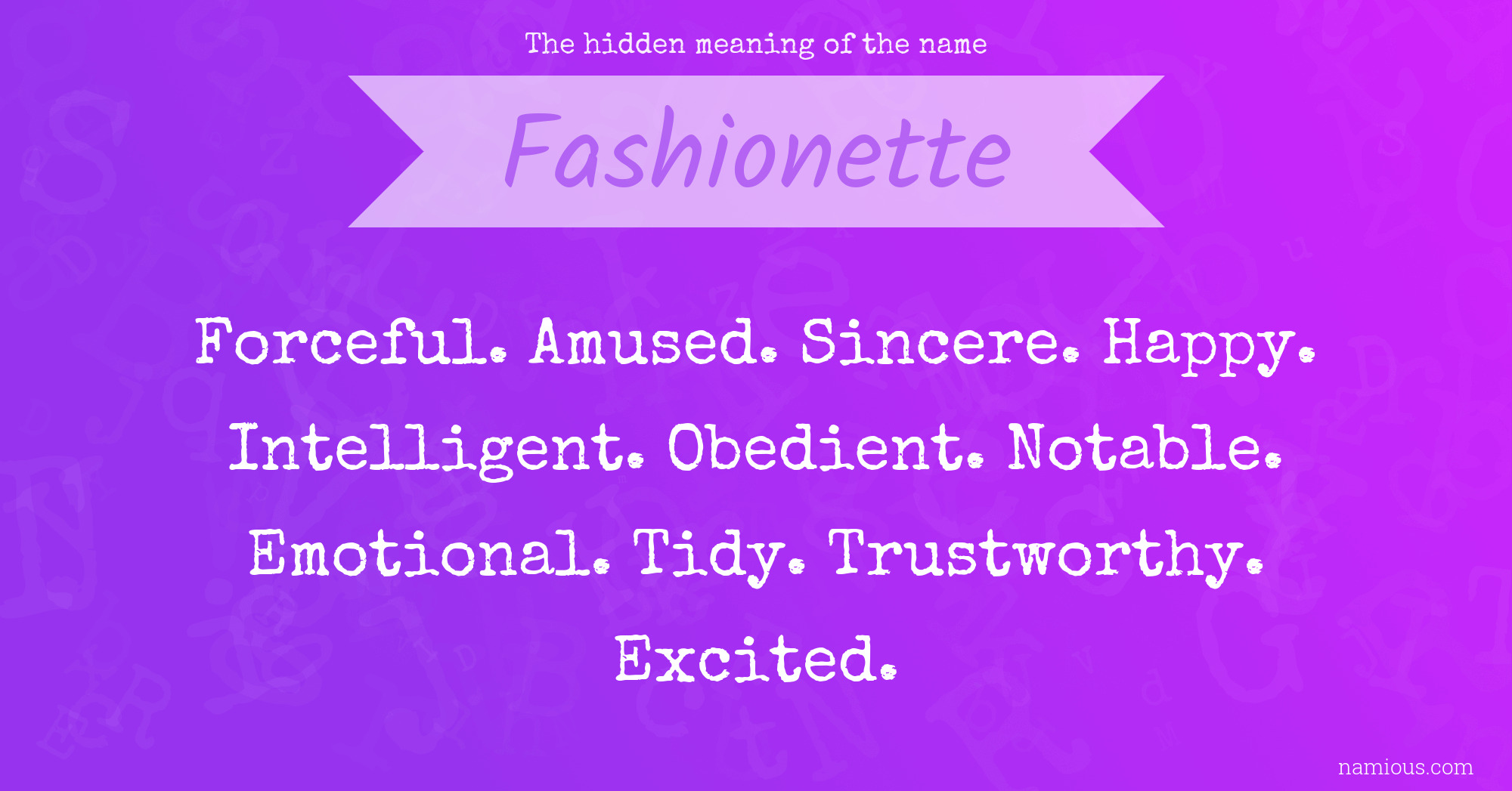 "Fashionette is a forceful, amused, sincere, happy, intelligent, obedient, notable, emotional, tidy, trustworthy and excited person."