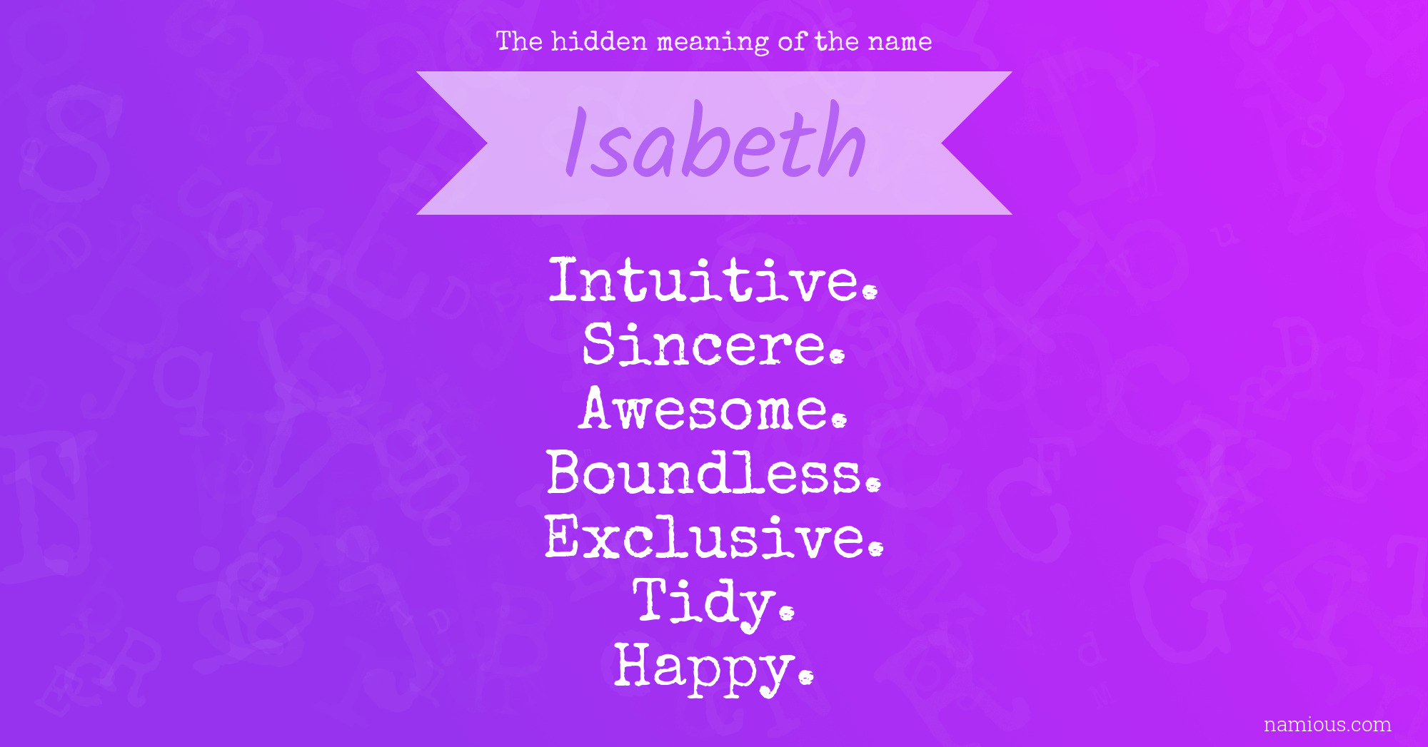 "Isabeth is an intuitive, sincere, awesome, boundless, exclusive, tidy and happy person."