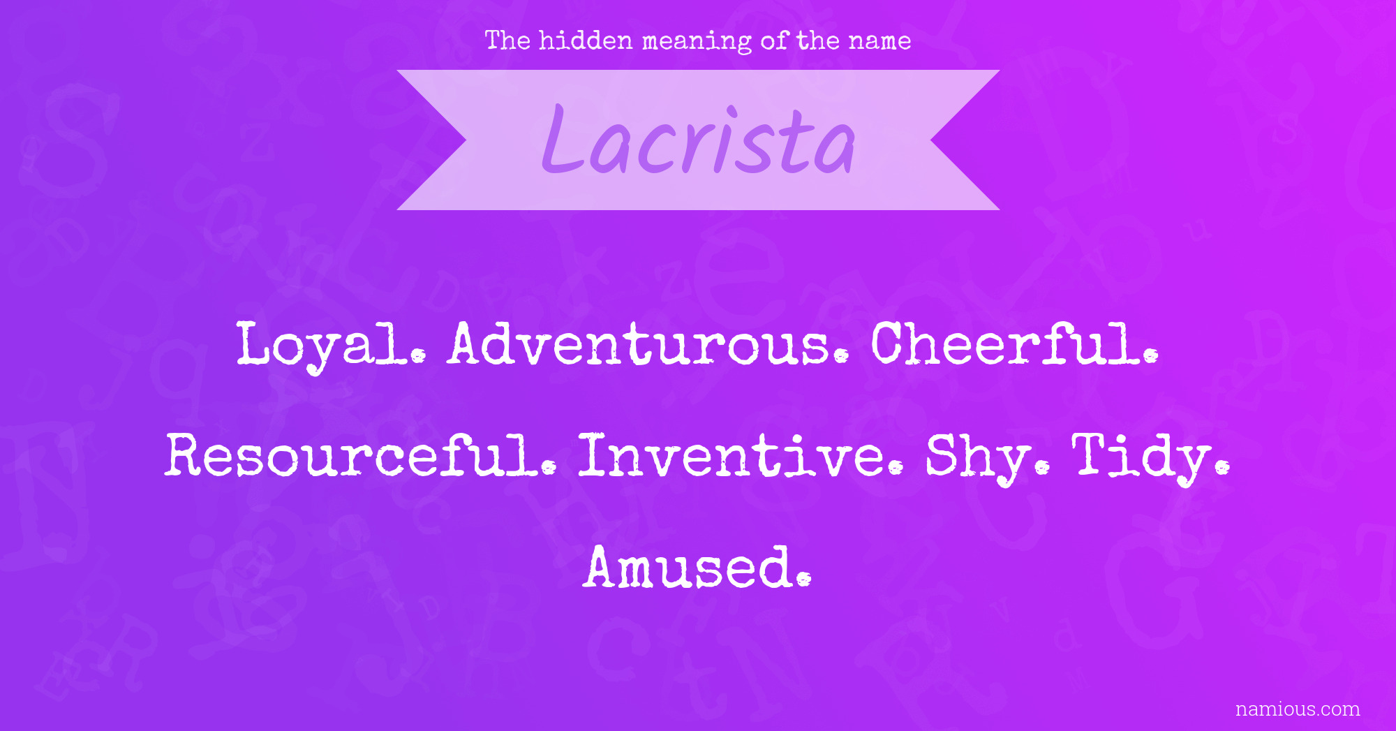 "Lacrista is a loyal, adventurous, cheerful, resourceful, inventive, shy, tidy and amused person."
