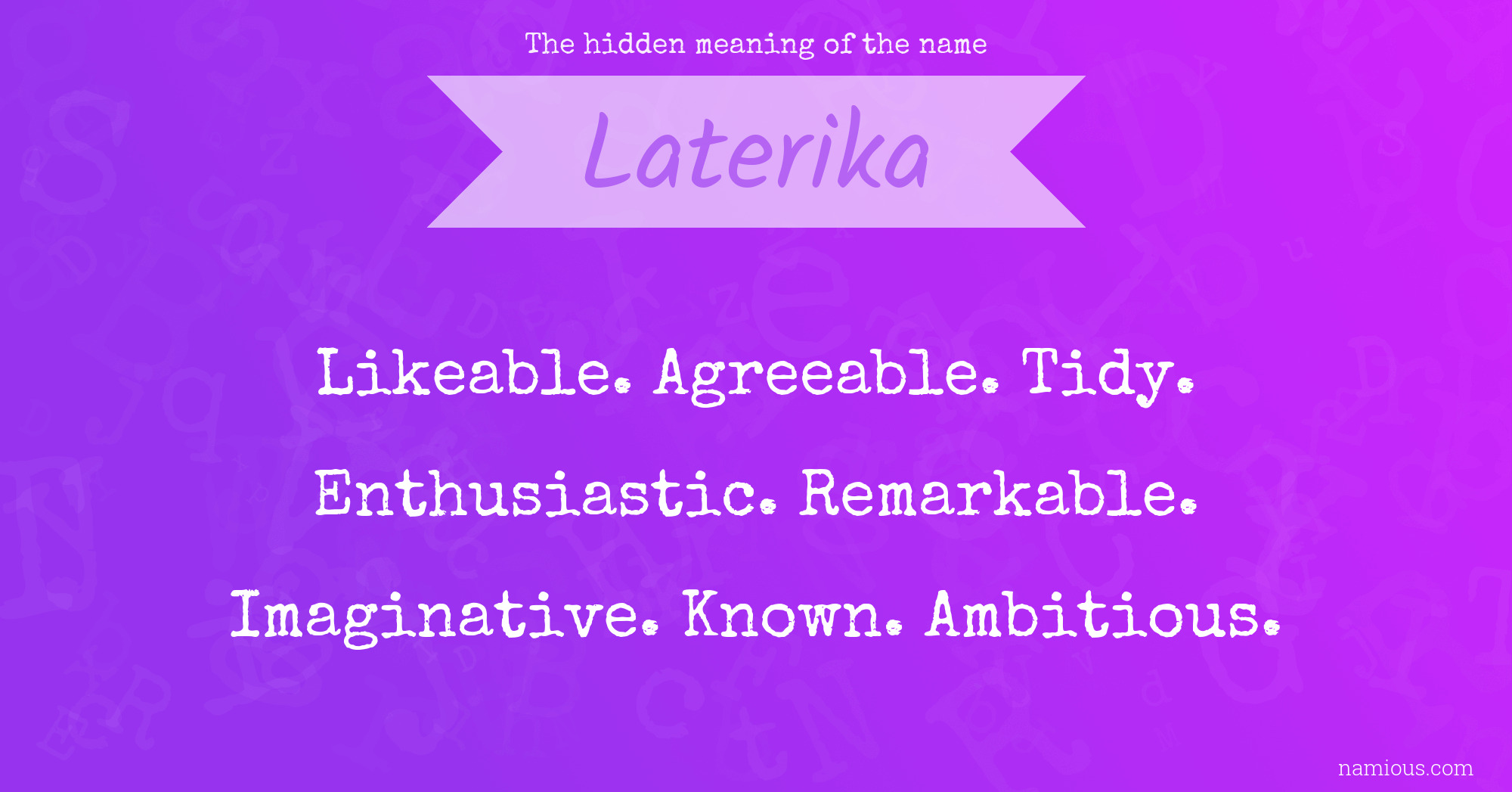 "Laterika is a likeable, agreeable, tidy, enthusiastic, remarkable, imaginative, known and ambitious person."