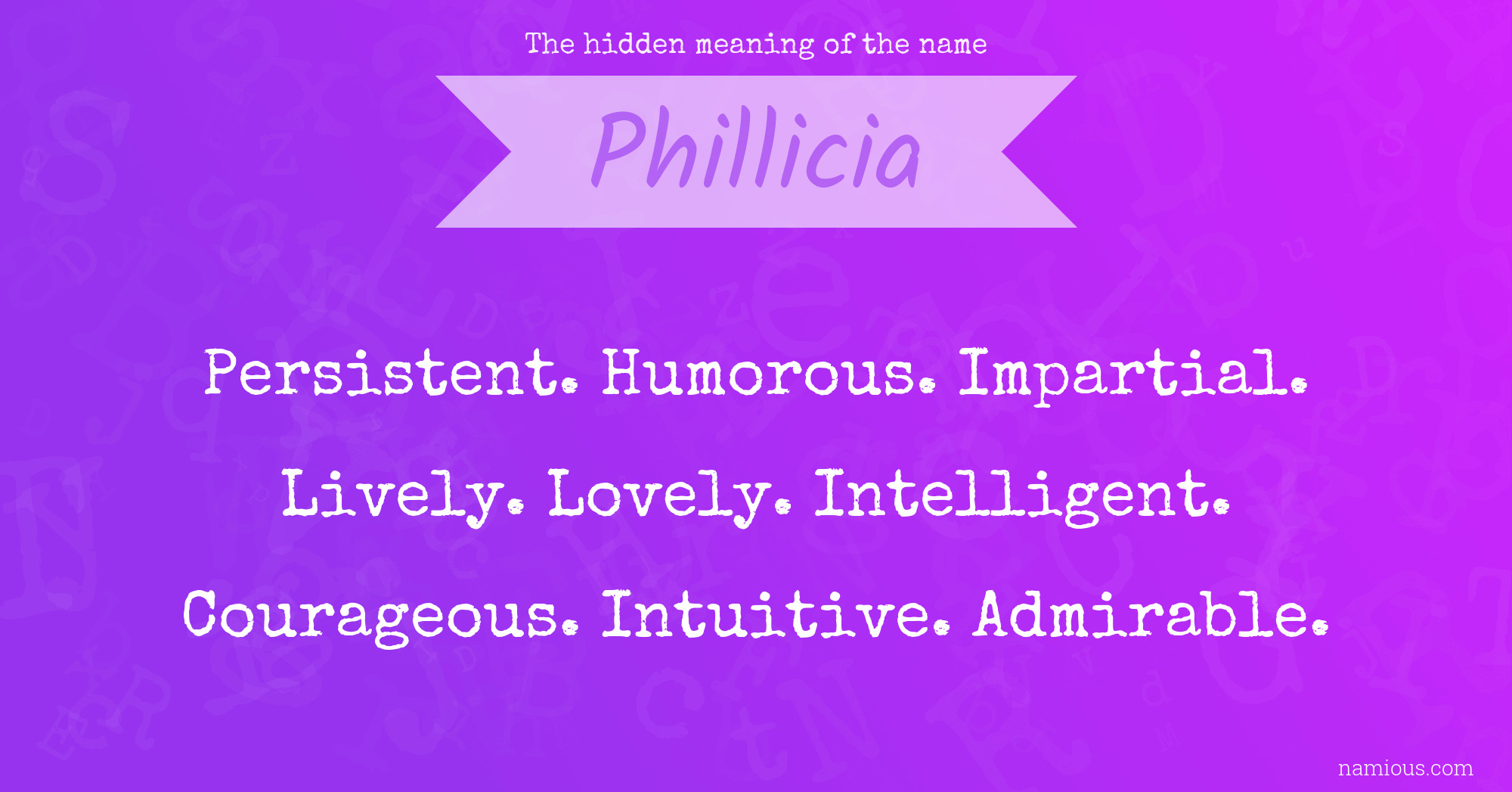 "Phillicia is a persistent, humorous, impartial, lively, lovely, intelligent, courageous, intuitive and admirable person."
