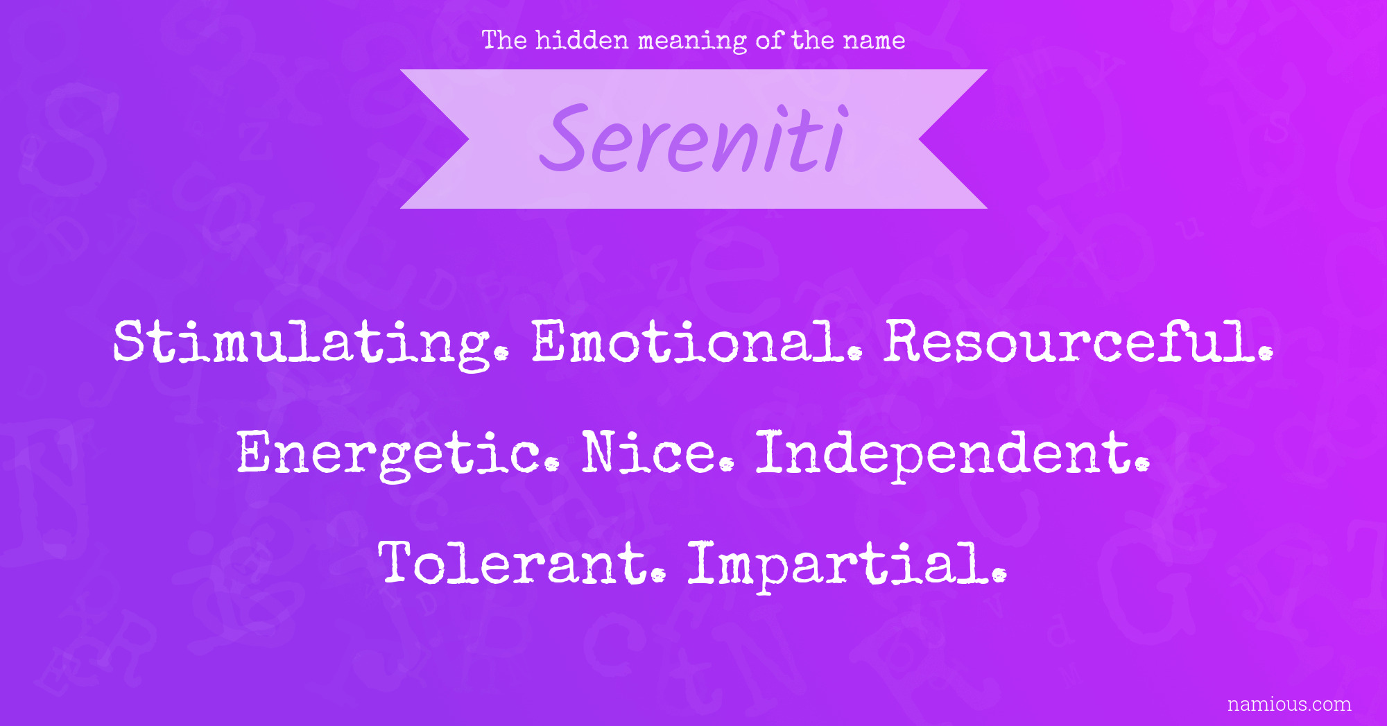 "Sereniti is a stimulating, emotional, resourceful, energetic, nice, independent, tolerant and impartial person."