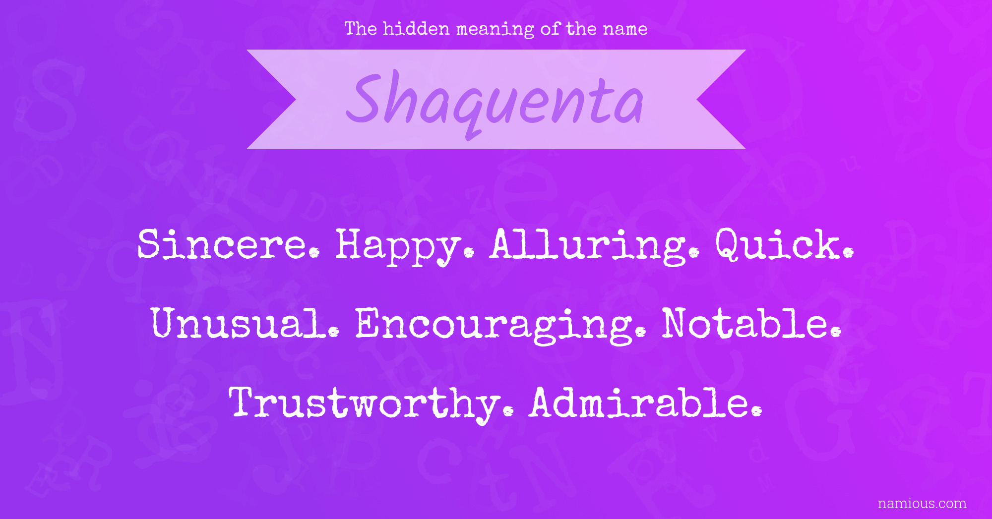 "Shaquenta is a sincere, happy, alluring, quick, unusual, encouraging, notable, trustworthy and admirable person."