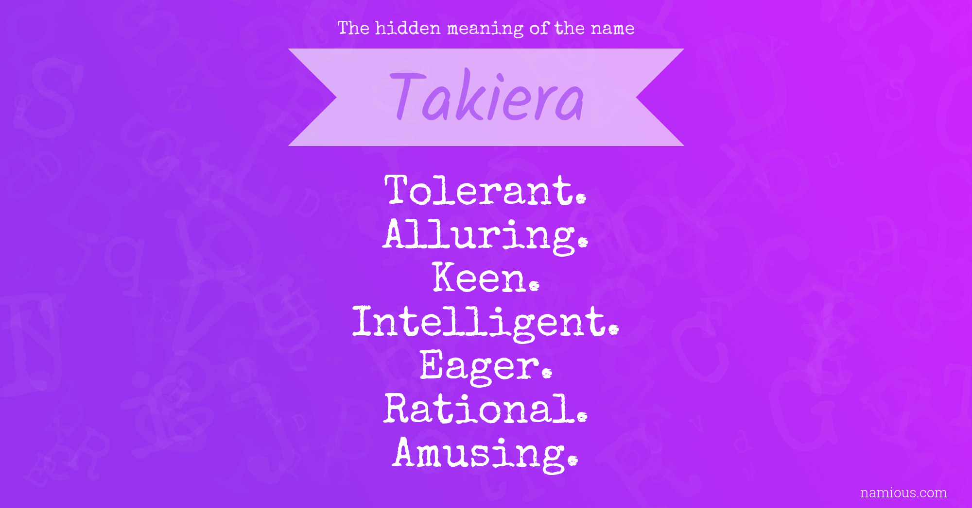 "Takiera is a tolerant, alluring, keen, intelligent, eager, rational and amusing person."