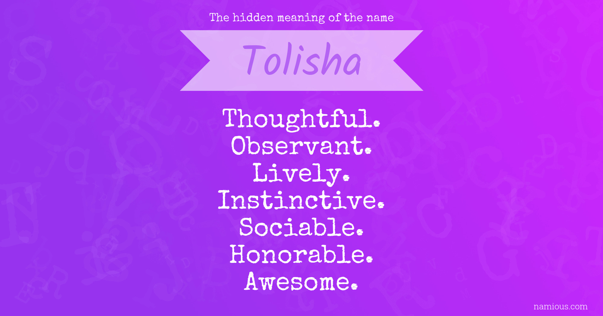 "Tolisha is a thoughtful, observant, lively, instinctive, sociable, honorable and awesome person."
