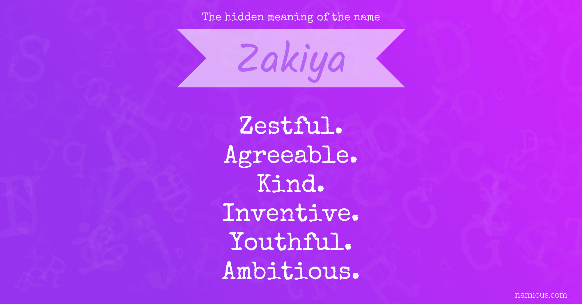 "Zakiya is a zestful, agreeable, kind, inventive, youthful and ambitious person."