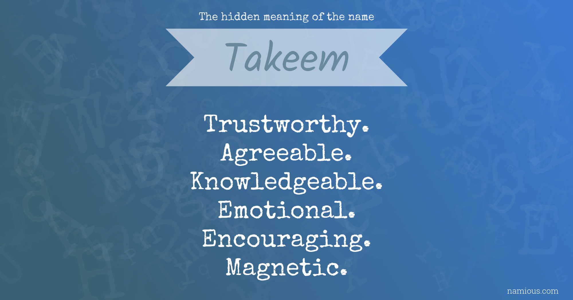 "Takeem is a trustworthy, agreeable, knowledgeable, emotional, encouraging and magnetic person."
